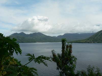 Heel vroeg in de morgen horen we het geluid van een tropische regenbui, maar als we opstaan schijnt de zon al weer. Na het ontbijt gaan we met een paar anderen een tochtje maken naar het gebied van de Minahassa. Wat is Indonesië toch groen! We stoppen op een heuvel waar een immens christusbeeld over de stad waakt. Dan gaan we naar het stadje Tomohon, met veel bloemen en kwekerijen, maar bovenal een erg leuke markt met natuurlijk heel veel groenten en fruit. We kopen wat jeruks (groene sinaasappels met de smaak van mandarijn) en proeven salak (vrucht met bruine geschubde schil). Op de visafdeling zien we o.a. schijven gerookte tonijn.