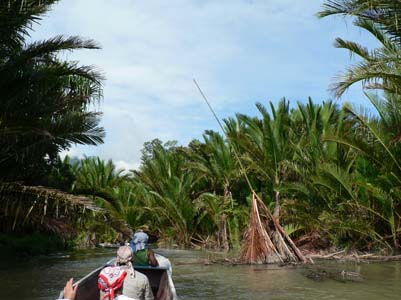 We stappen weer in de prauwen en varen dan eerst een eind over zee om vervolgens de Salawai-rivier op te varen.
