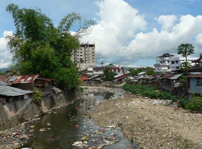 Onze aankoop bestaat uit jeruk (soort sinaasappel met de smaak van mandarijn) en salak, een peervormige vrucht met een bruine geschubde schil als een slangenhuid. Het is erg druk op straat en lang niet overal zijn trottoirs. En als ze er al zijn hebben ze vaak akelig grote gaten omdat de putdeksels verdwenen zijn. Oppassen dus dat je niet in het riool duikelt. De vele uitgebrande gebouwen, resten van de onlusten tussen 1999 en 2002, maken een macabere indruk.