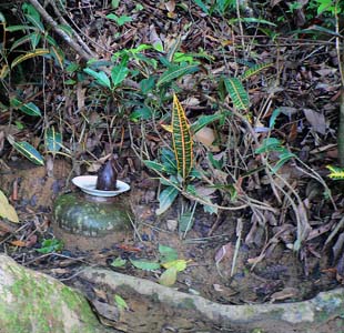 De rit gaat verder naar het hoog gelegen Soya Atas, waar we eerst op een muurtje in de schaduw onze lunch verorberen: crackers en het fruit dat we onderweg op de markt hebben gekocht. In Soya Atas staat het oudste Nederlandse kerkje dat uit 1817 stamt. Tijdens de recente onlusten werd het verwoest, maar is nu weer herbouwd. Van Soya Atas loopt een pad met trappen (bij 126 treden zijn we de tel kwijt geraakt) omhoog naar de heilige urn. Het is uiteindelijk wel even zoeken, want de pot zit half ingegraven. In deze urn zit altijd water, zelfs in de droge tijd. Dit water zou alle ziekten kunnen genezen en iedereen gelukkig maken.