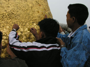 Van hieraf moeten we nog zo’n 40 minuten een behoorlijk steile weg naar boven klimmen. Dat kost veel energie, maar langs de weg zijn stalletjes met eten/drinken, traditionele medicijnen en souvenirs. Hoewel het niet meer regent lopen we letterlijk in de wolken en kunnen niets zien van de ongetwijfeld schitterende omgeving. Onderweg zien we dragers met grote manden boven hun hoofd de bagage van pelgrims naar boven sjouwen. En als je niet wil lopen kan je jezelf ook in een bamboe draagstoel door 4 mannen naar boven laten brengen (dit komt bij ons wel heel koloniaal over!). De Gouden Rotspagode is één van de heiligste plaatsen van Birma en beslaat een heel groot terrein. Dus schoenen weer uit en voorzichtig glibberen op de natte spekgladde marmeren tegels. De 7m hoge stoepa staat op een met bladgoud bedekt rotsblok dat op de de punt van een rots balanceert en is via een brug te bereiken, maar alleen mannen worden er toegelaten(!). De gelovigen brengen bladgoud op de rots aan en steken opgerold papiergeld tussen rots en rotsblok.