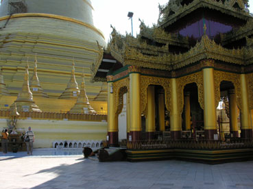 Voor boeddhisten is dit de heiligste pagode van het land omdat hier de relikwieën van vier boeddha’s liggen. Dagelijks komen er duizenden gelovigen. We zijn er al vóór 08.00 uur. Overdekte trappen op de vier windrichtingen leiden naar het platform op de 58m hoge heuvel. Uiteraard moeten de schoenen uit. Langs de trappen bevinden zich de stalletjes waar je offergaven kunt kopen; dit wordt ook veel gedaan. In het midden van het platform (5,6 ha) staat een massieve vergulde stoepa. Wat feitjes over de stoepa: hoog 98m, omtrek 433m. De spits bestaat uit ‘lotusbladen en een bananenknop’. De ijzeren parasol (1000kg) is bedekt met goud en edelstenen Bovenop een windvaan versierd met 1100 diamanten en 1400 edelstenen. Daarop een bol met 4350 diamanten met als bekroning een diamant van 76krt. De stoepa wordt jaarlijks verguld en de goudlaag weegt inmiddels 60 ton En dit allemaal in een land waar de meeste mensen arm zijn!Verder staan er paviljoens met 7 of 9 daken en zijn er voor de bezoekers plaatsen om te rusten. Het is overweldigend: de pracht en praal van de gebouwen, de enorme marmeren vloer, de hoeveelheid pelgrims die zo ingetogen bidt en offert, de monniken met hun rood-bruine en de nonnen met hun rose met oranje gecombineerde gewaden.