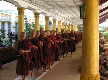 Een jongen wil op de foto. Dan nog eens. Hij poseert er speciaal voor; wil zeker fotomodel worden. Dan wil hij dat ik een derde foto maak, maar dat weiger ik; 2 foto’s van deze jongeman vind ik welletjes. We bezoeken ook de replica’s van de ontvangsthal van de koning en de koninklijke vertrekken. Veel goud e.d. maar het maakt op ons niet zo’n grote indruk; het leeft niet. Dan gaat de tocht naar een klooster waar 2000 monniken wonen. ’s Morgens in alle vroegte lopen de monniken door de stad om hun ontbijt bij elkaar te bedelen. Om 10.45 uur krijgen de monniken in het klooster hun lunch. Deze wordt geschonken door donateurs. Er wordt op een gong geslagen (de daar aanwezige honden beginnen bij dit geluid op slag erbarmelijk te janken en te blaffen) en dan komen ze in 2 héle lange rijen naar de eetzaal. Voor de eetzaal krijgt ieder een portie rijst in zijn nap uit een enorme ketel en in de eetzaal staan vlees en/of groenten. Er wordt in doodse stilte gegeten en je hoort alleen het gekras van het aluminium bestek.