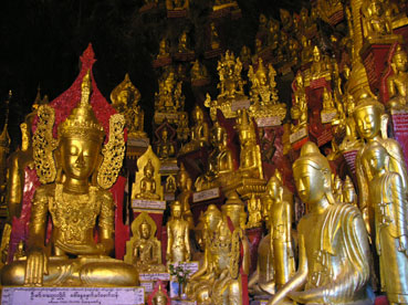 De rit gaat verder naar Pindaya, dat op 1200m hoogte aan een meer ligt. We lunchen in een restaurant met mooi uitzicht op het meer en gaan dan naar de Shwe U Min of Gouden-Grotpagode. De grot is 150m diep en bestaat uit een aantal ‘kamers’ van grote omvang. Binnen in de grot staan volgens de laatste telling 8094 boeddhabeelden, maar het aantal groeit nog steeds dankzij donaties. De grootte van de beelden varieert van enkele centimeters tot meer dan levensgroot. Ze zijn gemaakt van verschillende materialen, maar nu vrijwel allemaal goud gekleurd. De meeste beelden zijn in de loop der eeuwen door pelgrims neergezet. Een van de beelden zou zelfs uit ± 250 v.Chr. dateren.
