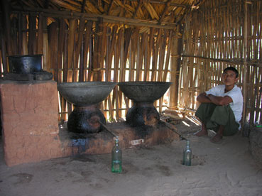 De nats zijn de geesten van mensen die in de loop der tijd op een onnatuurlijke manier om het leven zijn gekomen. De verering van nats komt voort uit het animisme. Er zijn goede en boze nats en ze wonen in bomen, meren, heuvels, etc. Als de nats niet tevreden worden gesteld kunnen ze veel kwaad aanrichten. Daarom wordt er veel geofferd: geld, bloemen, enz. Vanaf de voet van de heuvel leiden overdekte trappen (777 treden) naar de top waar een klooster, een pagode en heiligdommen van de nats staan. Omdat het een heilige plaats betreft en de schoenen dus uit moeten besluiten we de tocht naar boven niet te maken, aangezien het er wemelt van de apen en we vermoeden dat de trappen smerig zullen zijn van de uitwerpselen van deze dieren. In het dorp staan ook beelden van de nats en ook hier wordt druk geofferd: fruit, geld, bloemem maar ook kopjes koffie/thee en flessen sterke drank. Aan de reacties van onze medereizigers te horen hebben we de goede beslissing genomen door niet naar boven te gaan. In het dorp zien we een schooltje. Het is een lang gerekt gebouw dat door bamboe schotten verdeeld wordt in verschillende klasjes. Er zijn meer klassen dan leerkrachten. De leerstof wordt hardop (zeg maar gerust schreeuwend) opgedreund. De klasjes proberen elkaar te overstemmen en dat geeft een hels kabaal, maar ze kijken er allemaal heel blij en vrolijk bij. Op de terugweg naar Bagan gaan we nog even langs bij een palmsuikerbedrijf. Hier zien we hoe ze het suikerwater (toddy) met ronde stenen potten hoog uit de boom halen en het tot stroop inkoken. Van een deel wordt snoepgoed gemaakt. Een ander deel laten ze gisten en stoken er sterke drank van.