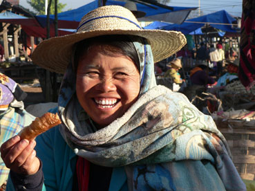 Tegen 07.30 uur stappen we het hotel uit om naar de 5-dagenmarkt te gaan. Deze markt wordt iedere dag in een ander dorp rond het Inlemeer en Kalaw gehouden en het schema rouleert per 5 dagen. Op deze markt komen vooral de bergvolken. Wederom is het weer leuk om naar de mensen te kijken.