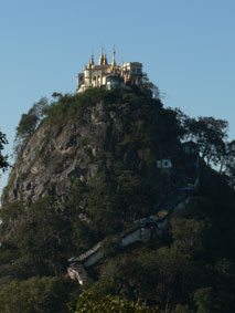 Vanmorgen gaan we naar Mount Popa, 60km van Bagan. De berg rijst vanuit de vlakte steil omhoog en heeft een hoogte van 1518m. Vroeger was Mount Popa een actieve vulkaan. De berg zou de woonplaats zijn van de 37 nats (geesten) en is een belangrijk bedevaartsoord.