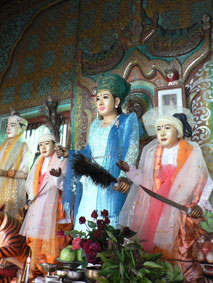 Birmezen geloven dat hun beschermgeest huist in de gebedspost die is verbonden met de dag van de week waarop ze zijn geboren Ze brengen hier offers, branden wierook en geven de boeddhabeelden en beschermgeest een ritiueel bad. Een Birmees met wie we aan de praat komen zoekt voor ons onze geboortedag op, zodat Jan en ik resp. bij de leeuw en de garoeda deze rituelen kunnen uitvoeren. Het zou ons en onze familie geluk, gezondheid en rijkdom geven. Niet dat we daarover te klagen hebben, maar kwaad kan het niet. Ook zagen wij de feestelijke ceremonie van een jongetje dat (tijdelijk) het klooster ingaat. Meestal gebeurt dit rond het 10e jaar. Een astroloog bepaalt de gunstigste dag. Deze jongen komt met zijn familie naar de pagode om te offeren; iedereen op zijn paasbest. De monnik in spe is gestoken in prinselijke kleding en getooid met sieraden. Hij stelt prins Siddharta voor in de tijd dat deze rijk was en de verlichting nog niet had bereikt. Daarna gaan ze naar het klooster. Hier legt de jongen zijn sieraden af, laat zijn hoofd kaal scheren en vraagt of hij mag toetreden. Na toestemming krijgt hij een monnikspij en bedelnap. Meestal blijft hij een paar dagen tot 3 weken en krijgt les in meditatie. Iedere Birmese man wordt geacht 2x in zijn leven (tijdelijk) in het klooster te gaan. De eerste keer rond het 10e jaar (enkele dagen), de 2e keer direct na de 20e verjaardag (3 maanden). Ze houden zich bezig met studie en meditatie. Monniken moeten celibatair leven en afzien van genot. Ze mogen niet slapen in bedden, niet eten na het middaguur en geen geld aannemen voor persoonlijk gebruik. Ze voorzien in hun levensonderhoud met bedelen. Vervolgens zijn we naar de Nga Htat Gyi-pagode gegaan waar zich bij het klooster een enorm beeld van boeddha, zittend op een lotustroon bevindt. Deze wordt wel de boeddha van 5 verdiepingen genoemd.