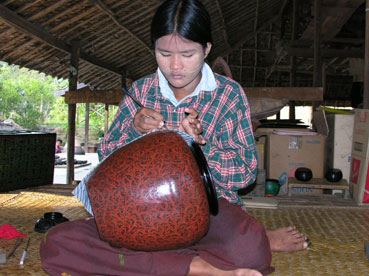 Vandaag gaan we opnieuw de omgeving per fiets verkennen. We rijden richting Oud Bagan en gaan eerst naar de That-byin-myn tempel, die erg tegenvalt. We fietsen kalmpjes verder, met af en toe een fotostop, naar het dorpje Myinkaba. Hier bezoeken we een bekend lakwerkatelier, waar we uitleg krijgen over het hele proces. Eerst wordt een vorm gemaakt van gevlochten bamboe, soms gecombineerd met paardenhaar. Deze wordt diverse malen gelakt (7 à 12 keer). Elke laklaag moet een week drogen Daarna worden de patronen en kleuren in verschillende rondes aangebracht.